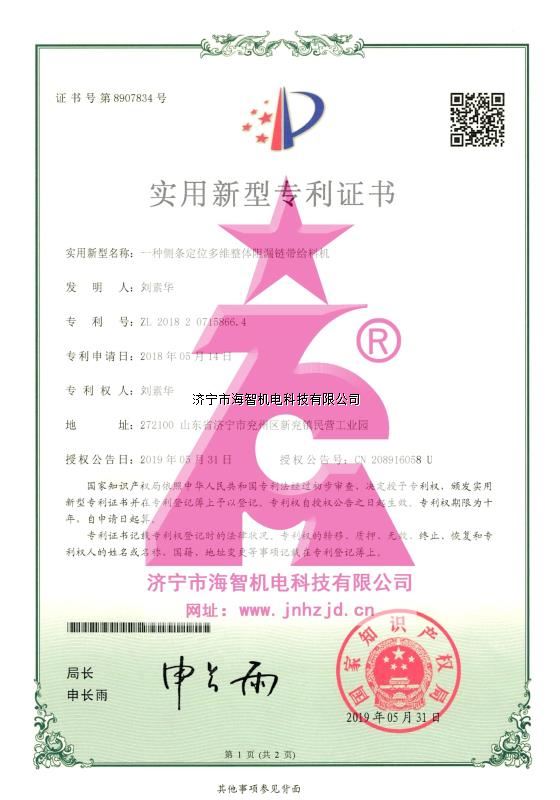 1、該機構(gòu)由膠鏈帶、側(cè)定位條、鏈帶鎖緊件、鏈齒輪驅(qū)動件、改向滾筒、清料裝置、驅(qū)動總成、導(dǎo)料槽、機底架等組成,側(cè)定位條設(shè)置于膠鏈帶端部伸出,鏈帶鎖緊件將側(cè)定位條端部鎖在膠鏈帶上形成整體阻漏側(cè)條定位膠鏈帶,膠鏈帶環(huán)扣在鏈齒輪驅(qū)動件和改向滾筒上,鏈齒輪驅(qū)動件驅(qū)動膠鏈帶,帶動側(cè)定位條繞鏈齒輪驅(qū)動件和改向滾筒循環(huán),側(cè)定位條帶動膠鏈帶穩(wěn)定輸送物料;